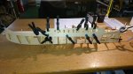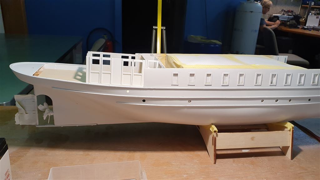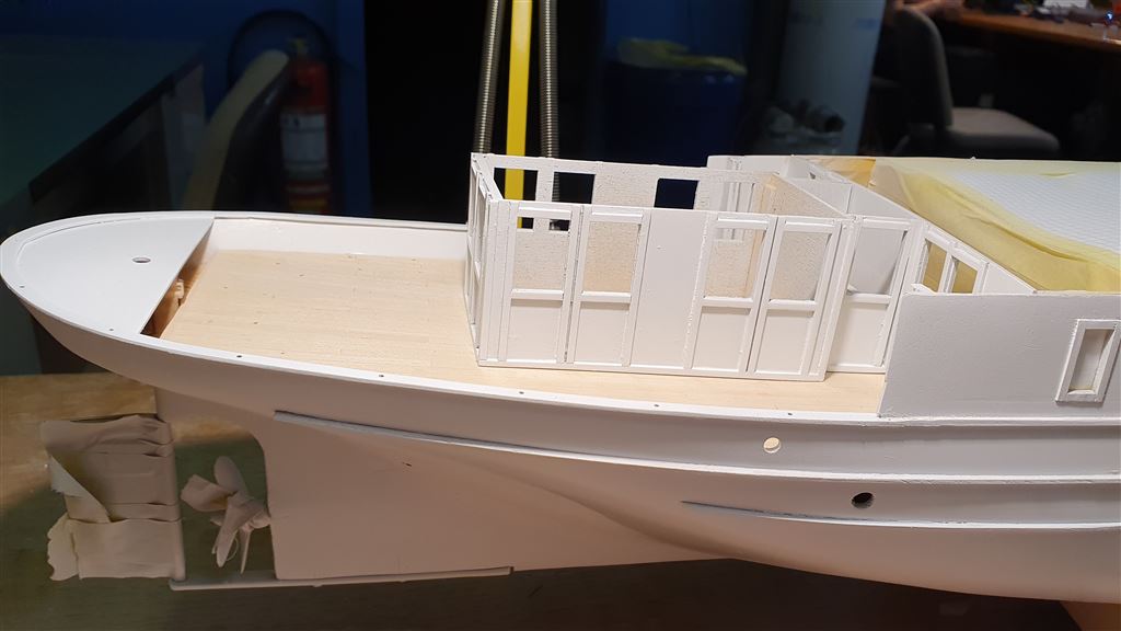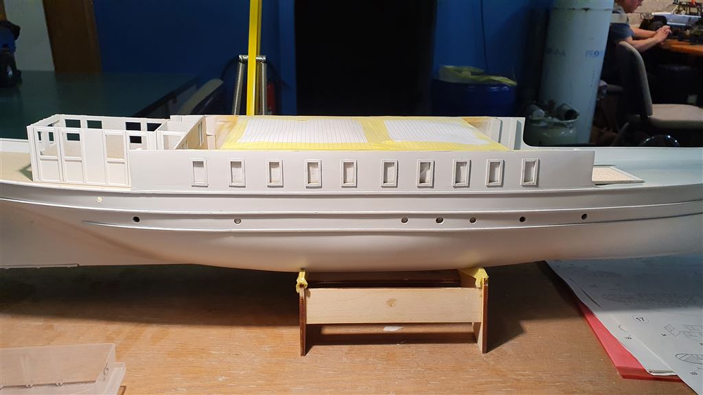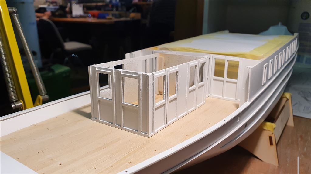 | November 2020 Zwischenzeitlich hat sich einiges getan. Die Fenster wurden mit Rahmen versehen und alles wurde grundiert und gespritzt. Die beiden Hauptdecks sind erstellt und auch beplankt. Die Aufbauten des Hauptdecks sind fast fertiggestellt und ebenfalls weiss gespritzt. Jetzt ist die Sitzbank im Heckbereich dran. Da sich das mitgelieferte Holzmaterial als absolut unbrauchbar (sehr brüchig und instabil) erwiesen hat, habe ich mich wieder dem Kunststoff zugewandt. Bei so kleinen Teilen ist das einfach stabiler und weniger brüchig. Wird ja sowieso braun gespritzt, man sieht also schlussendlich keinen Unterschied. |