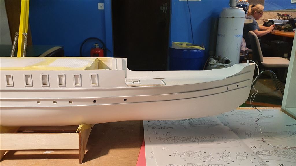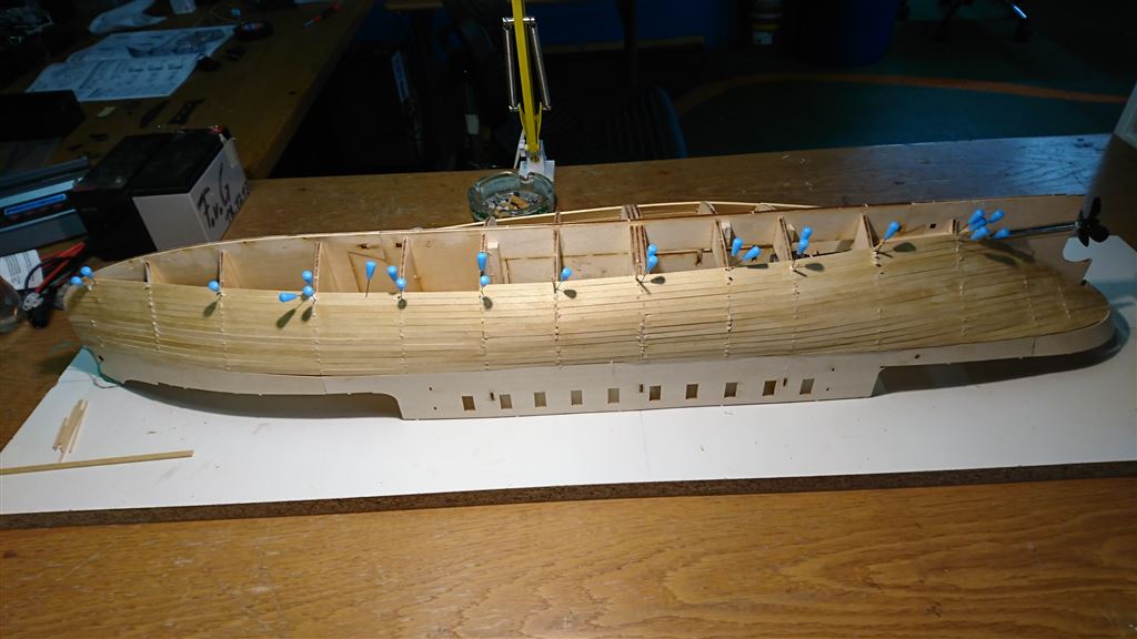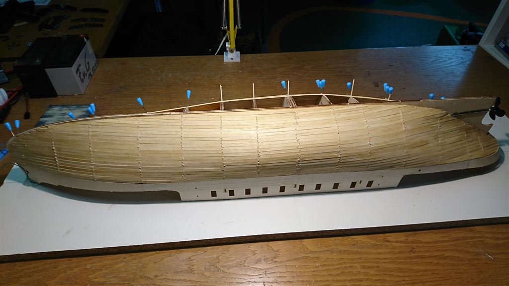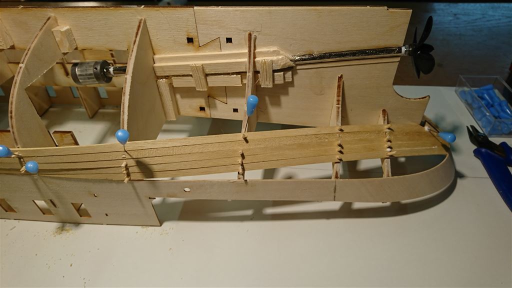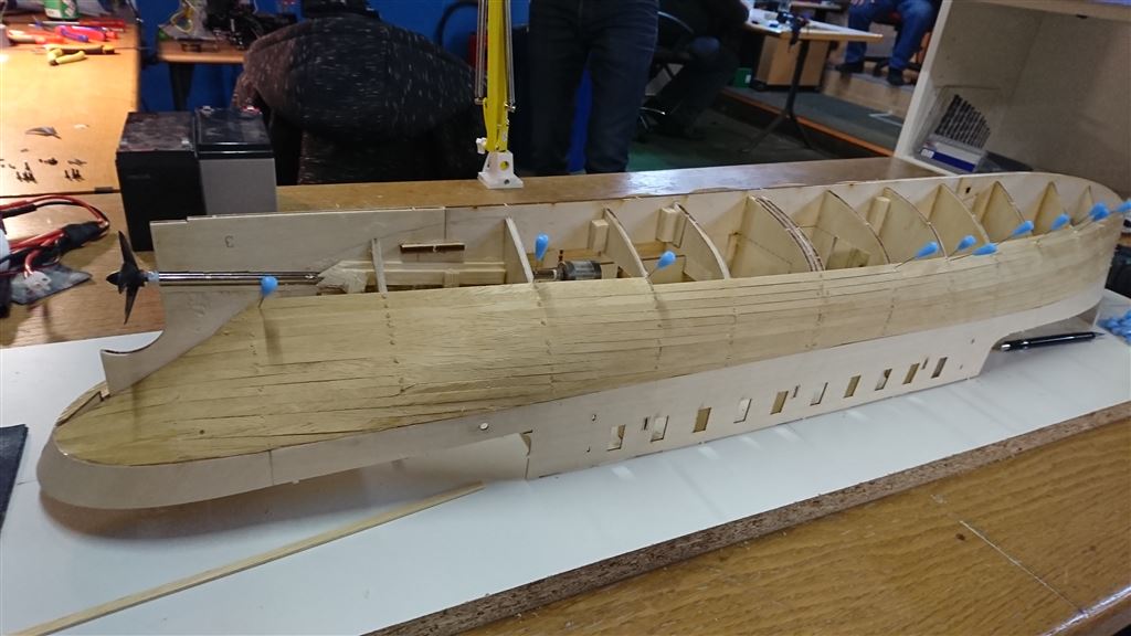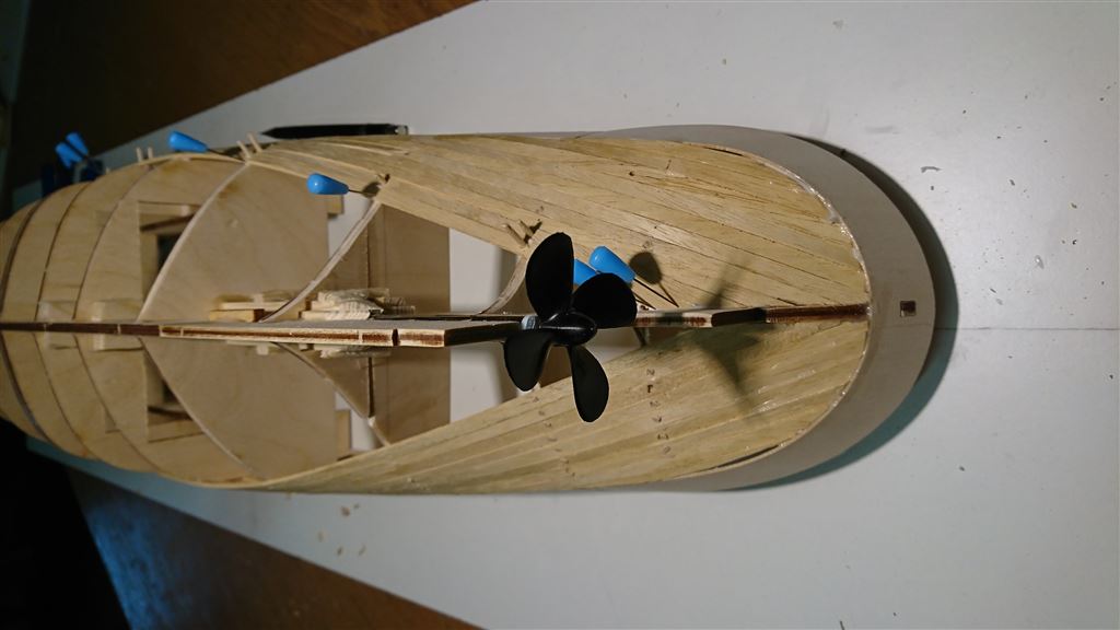 | September 2019 Nachdem ich ein wenig mit dem Schicksal betreffend des Holzmodells gehadert habe, ist der Bau doch bereits in Gang gekommen. Der Spantenaufbau und die Beplankung haben mich als "Holzneuling" ziemlich gefordert. Mittlerweile ist der Rumpf aber fertig beplankt und auch bereits verspachtelt und geschliffen. Ebenso sind die Bullaugen bereits gebohrt, die Fensteröffnungen erstellt die Scheuerleisten montiert. Die Antriebswelle inklusive Motor ist eingebaut und ein funktionsfähiges Ruder wurde konstruiert. |
