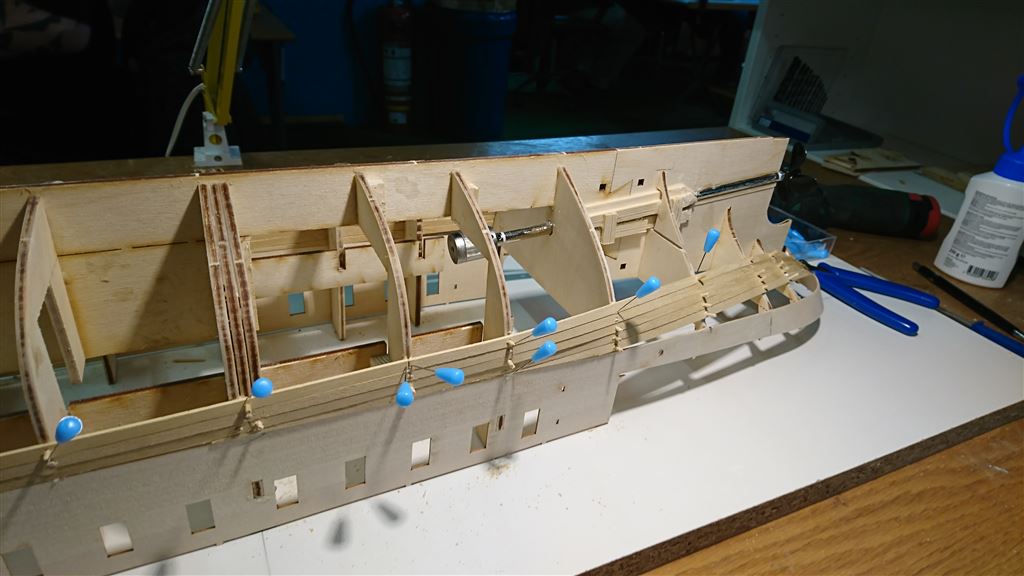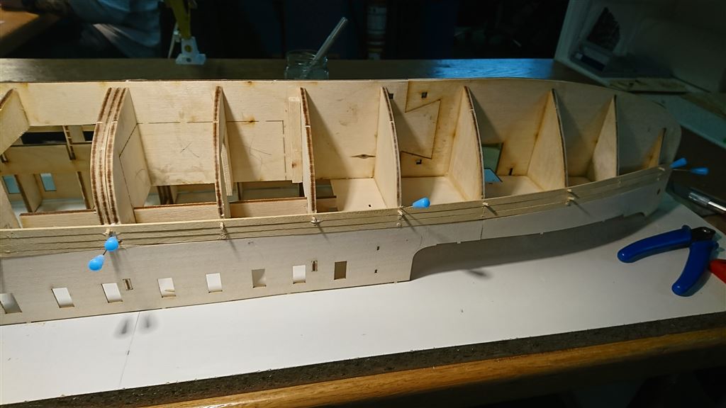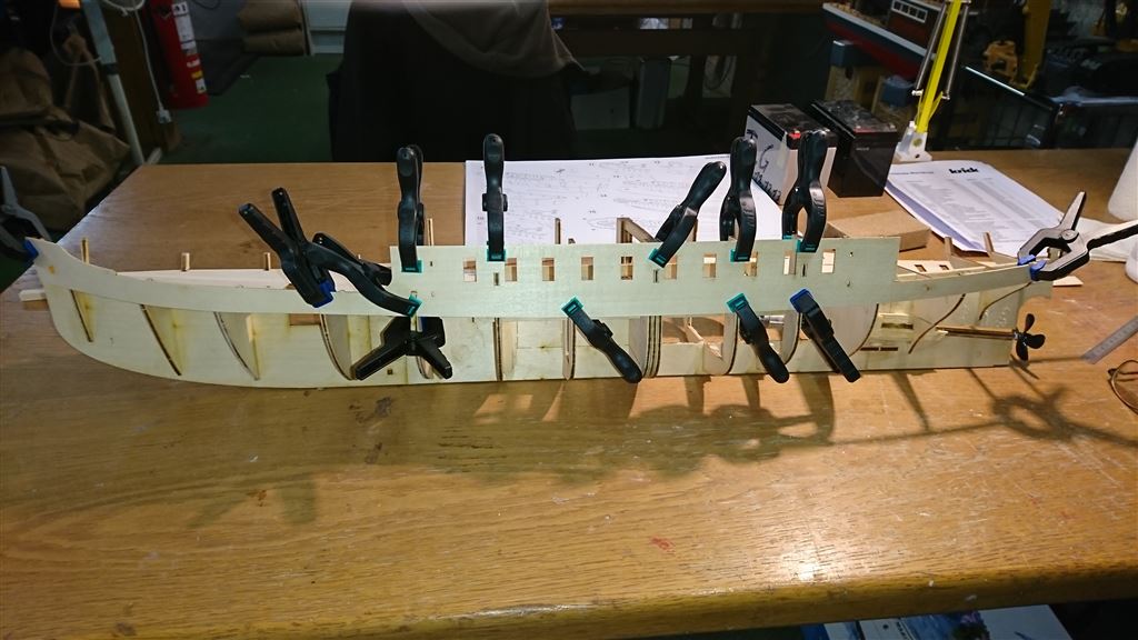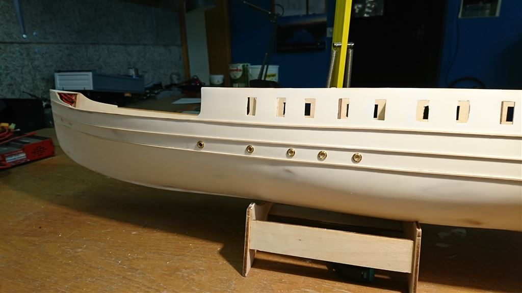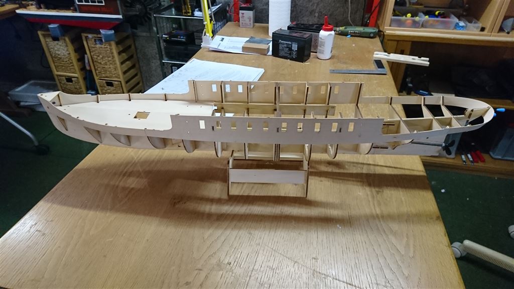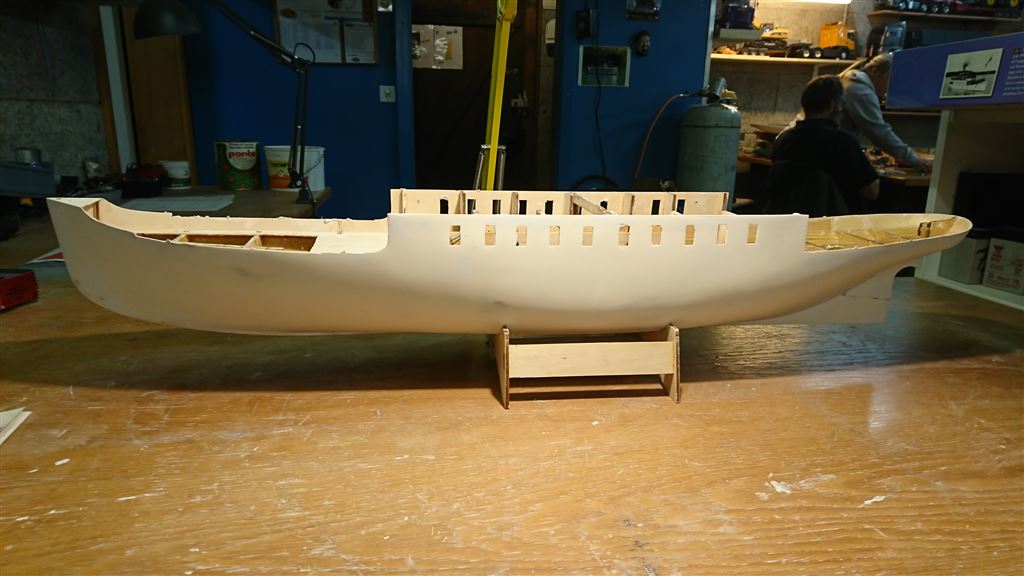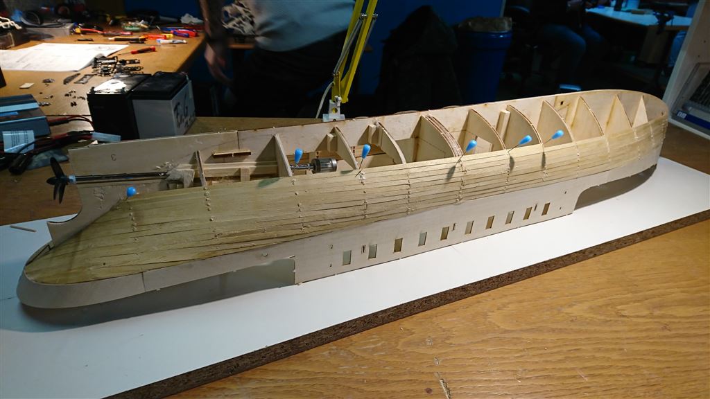 | September 2019 Nachdem ich ein wenig mit dem Schicksal betreffend des Holzmodells gehadert habe, ist der Bau doch bereits in Gang gekommen. Der Spantenaufbau und die Beplankung haben mich als "Holzneuling" ziemlich gefordert. Mittlerweile ist der Rumpf aber fertig beplankt und auch bereits verspachtelt und geschliffen. Ebenso sind die Bullaugen bereits gebohrt, die Fensteröffnungen erstellt die Scheuerleisten montiert. Die Antriebswelle inklusive Motor ist eingebaut und ein funktionsfähiges Ruder wurde konstruiert. |
